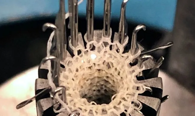 Некоторым пациентам, которым требуется замена поврежденных артерий, добывают необходимый для этого сосуд из ноги пациента. Однако не всегда у человека возможно изъять подходящий сосуд. Поэтому ученые пришли к решению создавать искусственные артерии из нитей коллагена и синтетических волокон. Разработкой таких тканей занялась совместная команда Университета штата Северная Каролина и Университета Кейс Вестерн Резерв (США). За основу были взяты волокна полимолочной кислоты и нитевидный коллаген для получения в дальнейшем гибридной пряжи. Эта пряжа была помещена в круговязальную машину, благодаря чему удалось связать трубку, которая ничем не отличается от человеческой артерии. Самое интересное, что рукотворная артерия является только каркасом для трансплантата, который выполняет только временную функцию. На этом каркасе высаживаются собственные эндотелиальные клетки пациента, которые и выстроят стенки артерии. Коллаген кратно улучшает адгезию структуры. Пока ученые удовлетворены лишь механикой артерий. Однако предстоит еще скорректировать структуру и уменьшить толщину тканей, чтобы каркас стал более плотным, и не происходила утечка крови.