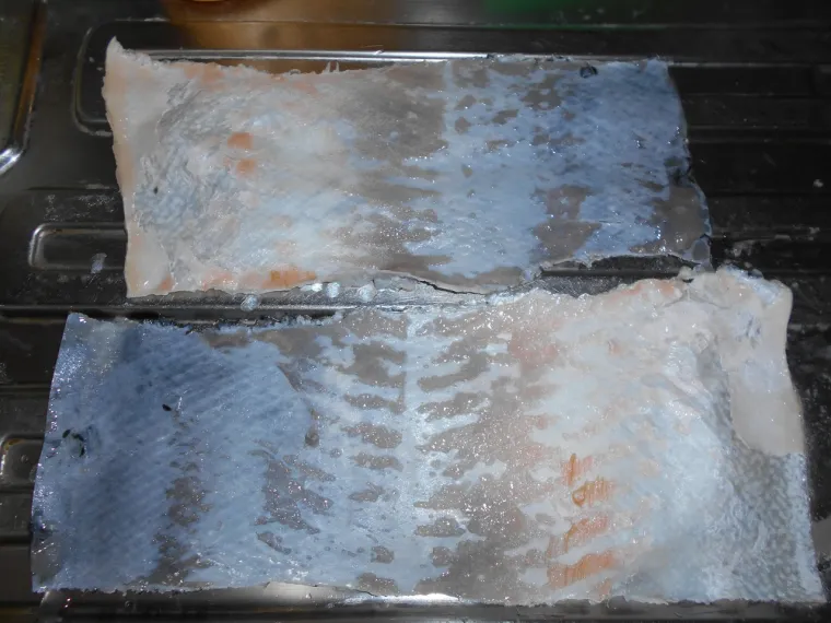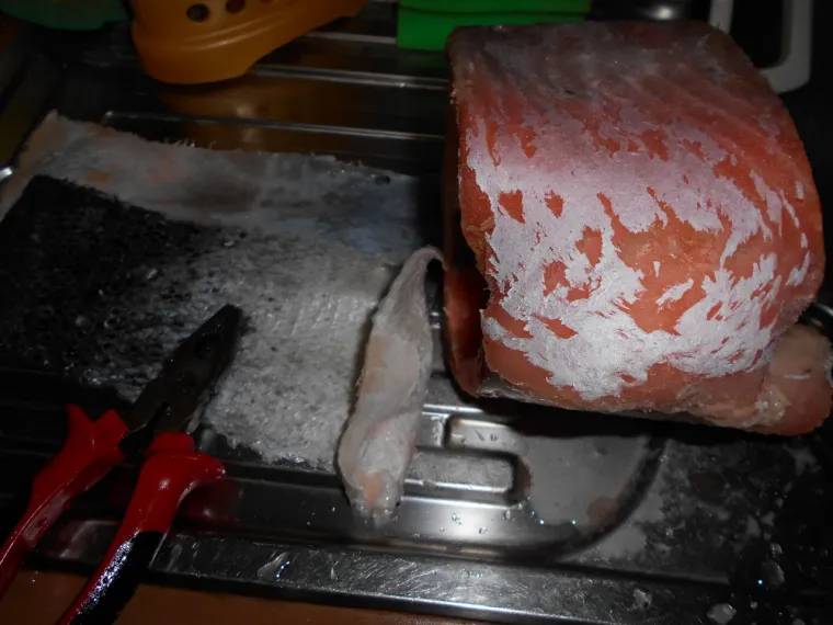 нужно для того , чтобы не устать . Мне неохота чистить чешую и кожа тоже не понадобиться . Поэтому в дело идет не совсем кухонный инструмент . Ополаскиваем рыбу в холодной воде , делаем надрез и снимаем кожу пассатижами . Такой номер у Вас не получится , если рыба уже оттаяла