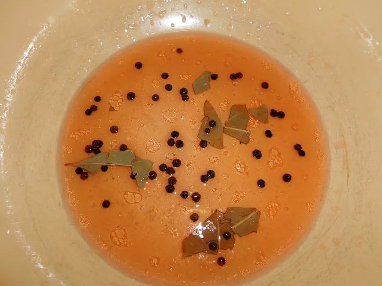в чашку , где оттаивала рыба , кладем черный перец горошком и лавруху