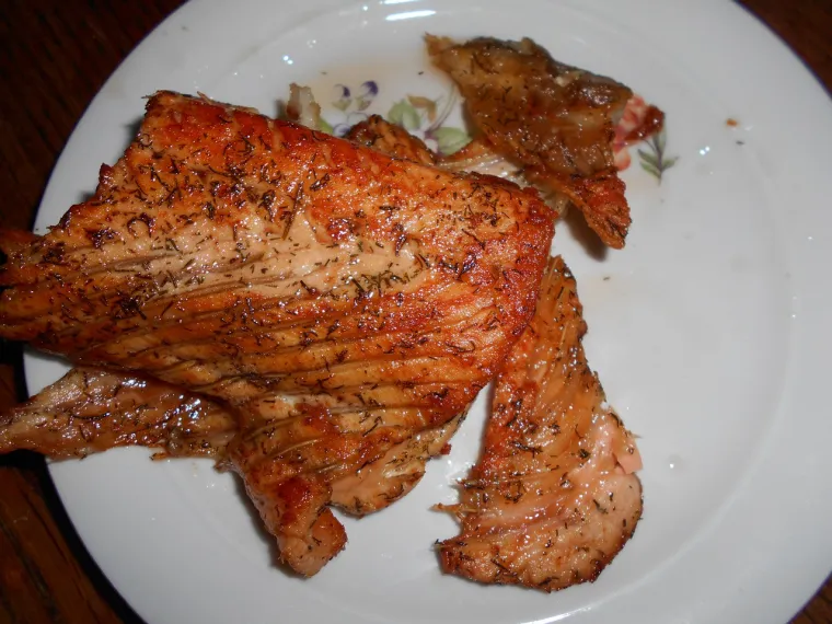 после того как рыба оттает удаляем кости и плавник . Для этого их аккуратно вырезаем острым ножом. Это все пойдет на жареху . Посыпаем солью и укропом пусть постоит и можно на сковородку .
