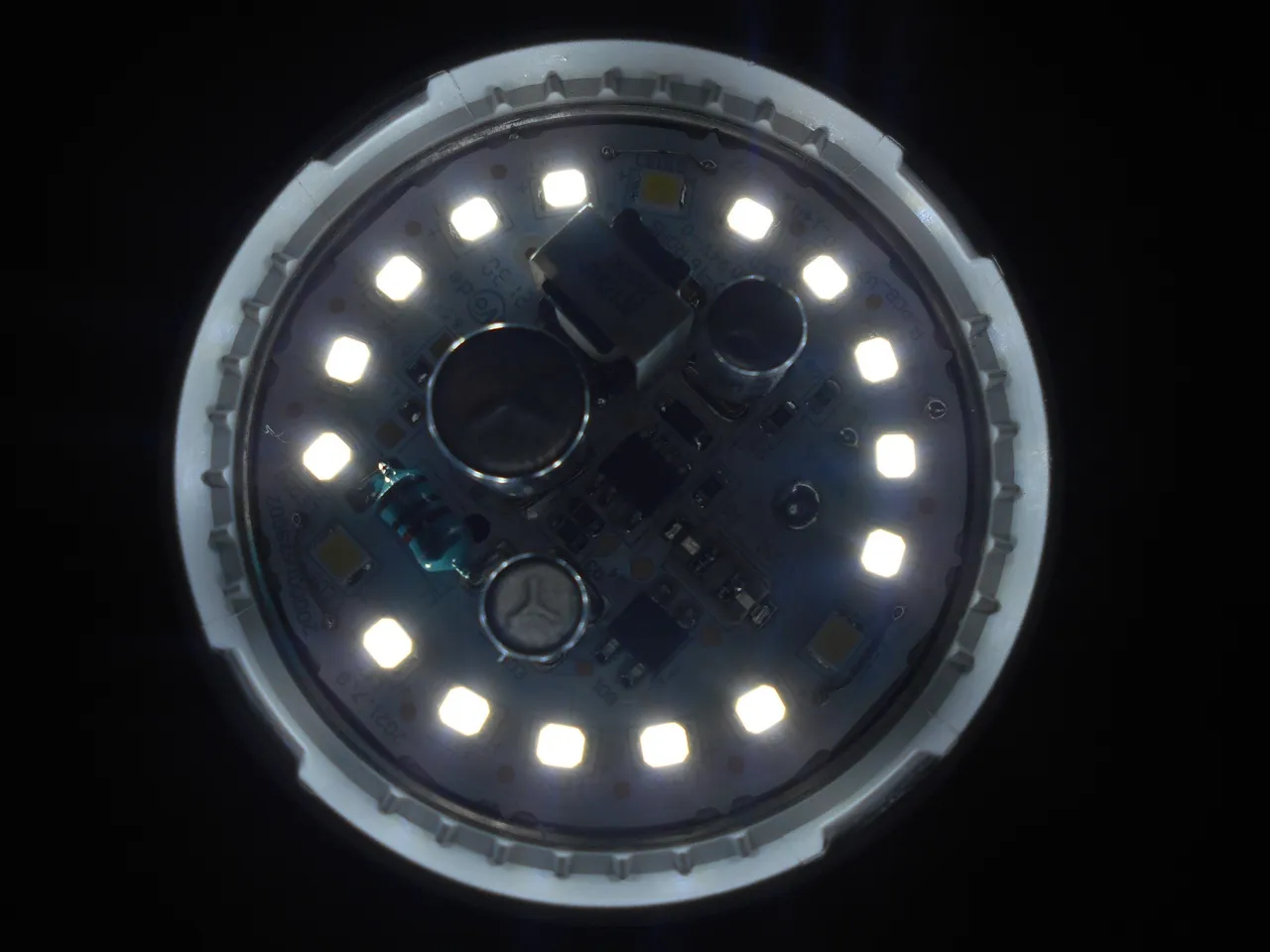 О, как интересно! 7 диодов. 3 сконцентрированы сверху, 4 оставшихся раскиданы по трафарету через пустующие посадочные места. Дорожки на плате видно, но они какие-то витиеватые. И тут я вижу, что у трёх диодов сверху написано ABCDEF. У оставшихся гнёзд маркировка по две буквы: CD, DF, EF, CE. Оставшиеся 4 диода сидят на гнёздах CD (2 диода) и DF (2 диода). Прикольно, что 3 гнезда сверху мультифункциональны, а остальные подходят под определённую ветвь и маркировка рядышком нанесена, чтобы не запутаться. Мне понравилось это решение, раньше не видал такого. Так же видны рожки платы с драйвером. Уважаю такой подход, когда разводят мух и котлеты по разным платам. Это выигрышный по температуре вариант, но дороже по деньгам. Сами понимаете, на партию в 100.000 Ламп нужно дополнительно 100.000 текстолитов под драйвера.
