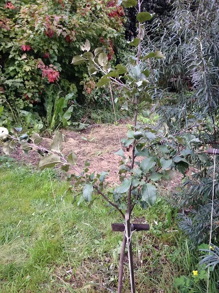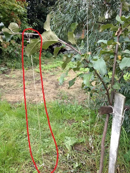Яблоки на яблоне растут только на ветках, которые расптолагаются параллельно земле или под небольшим углом. А как научить молодую яблоньку давать урожай не через 5-7 лет, а пораньше, чтобы не дожидаться когда у нее вырастут вычитали в журнале, что надо отгибать ветки, растущие под острым углом к стволу к земле. Вот смотрите что у нас получилось.