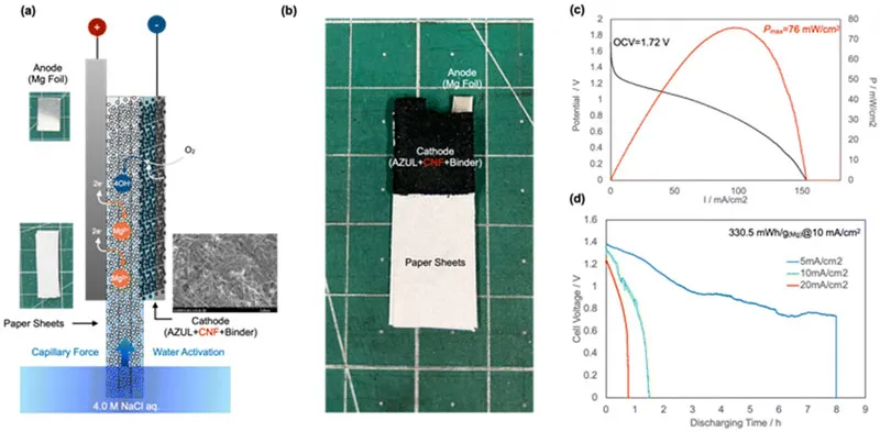 В одной из статей на научном портале было детально рассказано о новой разработке. Высокоэффективная бумажная батарейка уже была протестирована на пульсоксиметре и GPS-регистраторе. В ней используются нейтральный электролит и безопасный высокоэффективный электрокатализатор AZUL на основе пигмента. Процесс изготовления заключается в проклеивании фольги из магния с бумагой, после чего создается катодный катализатор на одной стороне и газодиффузионный слой на противоположной стороне батареи.