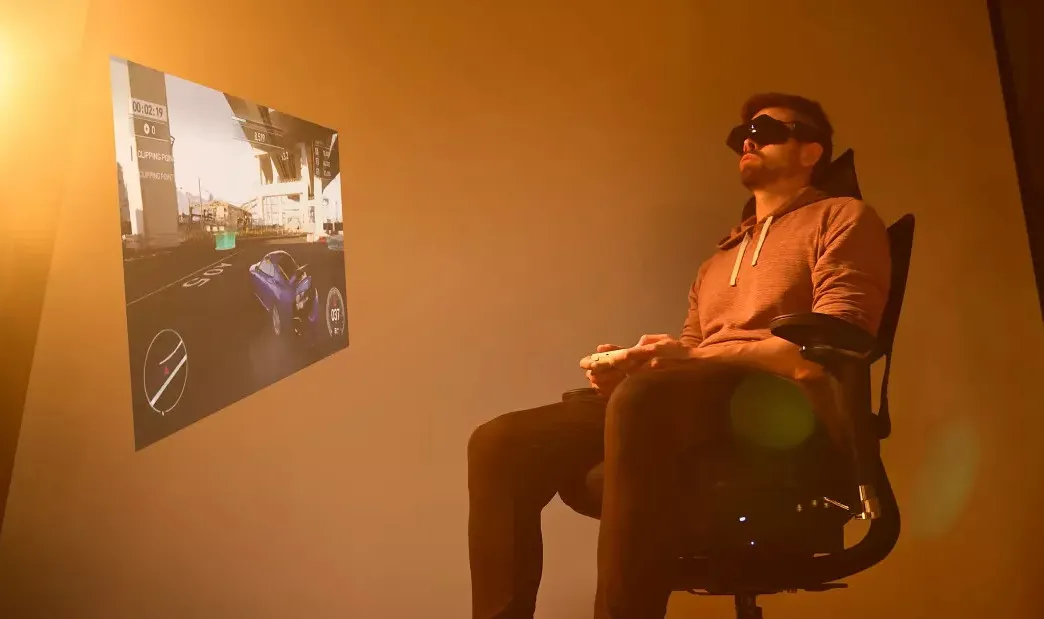 Финальный аккорд — виртуальный монитор. Физического экрана нет вообще: вместо него — гарнитура Bigscreen Beyond VR. Она транслирует полноценное изображение рабочего стола в формате 1080p прямо перед глазами. Кабель от неё хитроумно скрыт в подголовнике, и даже наклон спинки не нарушает целостность системы.