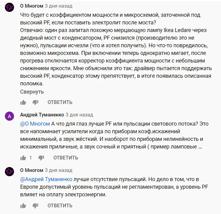 В последнем видео была разобрана лампа Сяоми и не совсем понятно решение инженеров повысить коэффициент мощности за счет светового потока. Что на Ваш взгляд важнее ? Высокий коэффициент мощности или качество светового потока ? Если в лампе GP после моста установлен электролит 4,7 мкф , то тут его нет . Единственный электролит 82 мкф на выходе драйвера и он не справляется с пульсациями светового потока