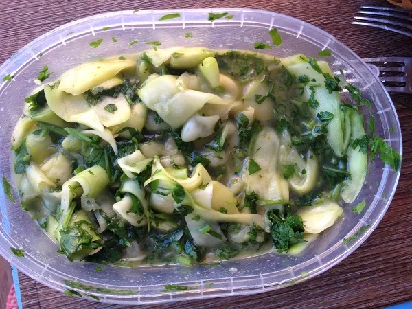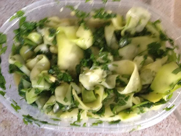 Состав молодые кабачки или цуккини - 2 шт (~400-500 г), чеснок - 2-3 зубчика, оливковое или растительное масло - 100 мл, белый винный уксус - 3 столовых ложки, зелень петрушки, мед - 1 столовая ложка (мед можно заменить 0,5 ч. л. (или по вкусу) сахара), соль, перец горошком или свежемолотый перец