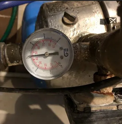 На фото магазина не мой 35 литровый, а какой то поменьше - худенький, а мой такой же, но толстенький . 12 бар максимальное рабочее давление этого бака, вместо 5 бар, которые у баков СО. Разница очень большая. Цвет бака, оно, конечно, почти все равно, красный он или белый, но , согласитесь, когда вместе с белым бойлером стоит белый расширительный бак это смотрится хорошо. Даже в котельной, которую, кстати, я считаю главным помещением своего дома. Кроме простой замены бака я решил поставить манометр, для измерения давления в системе ГВС. Раньше я почему то был уверен, что в штатном режиме эксплуатации дома, давление в ГВС не бывает выше давления в системе холодного водоснабжения (ХВС). Давление же в ХВС у меня нагнетает из колодца самовсасывающий насос насосной станции и максимум который я имею в ХВС это 3 бара: