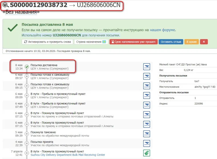 @Светотехника кто как на Али. Одни мухлюют , другие стараются . В одном недавнем заказе продавец дал трек отслеживаемый . Прождал больше месяца и посылку получили в Алматы , а я живу в Нур Султане . Получается дал один трек двум , а может и больше покупателям. Но посылка то одна и ушла по тому адресу куда ее отправили, т.е. в Алматы. Я отслеживал чужую посылку выходит и ничего не получил . Китайцы как всегда считают себя самыми умными , а по сути прохиндеи мошенники попадаются