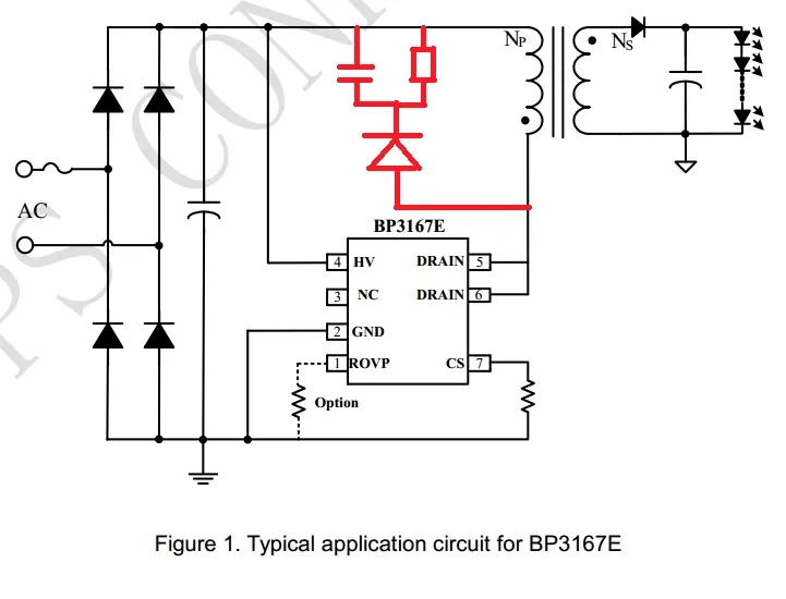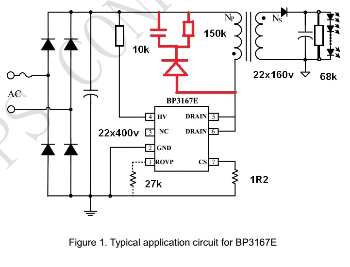 красным показана цепь которая ОБЯЗАТЕЛЬНО должна быть в обратноходовом - она нужна чтобы напряжение на микросхеме, после этапа запаса энергии - не превысило допустимого значения.