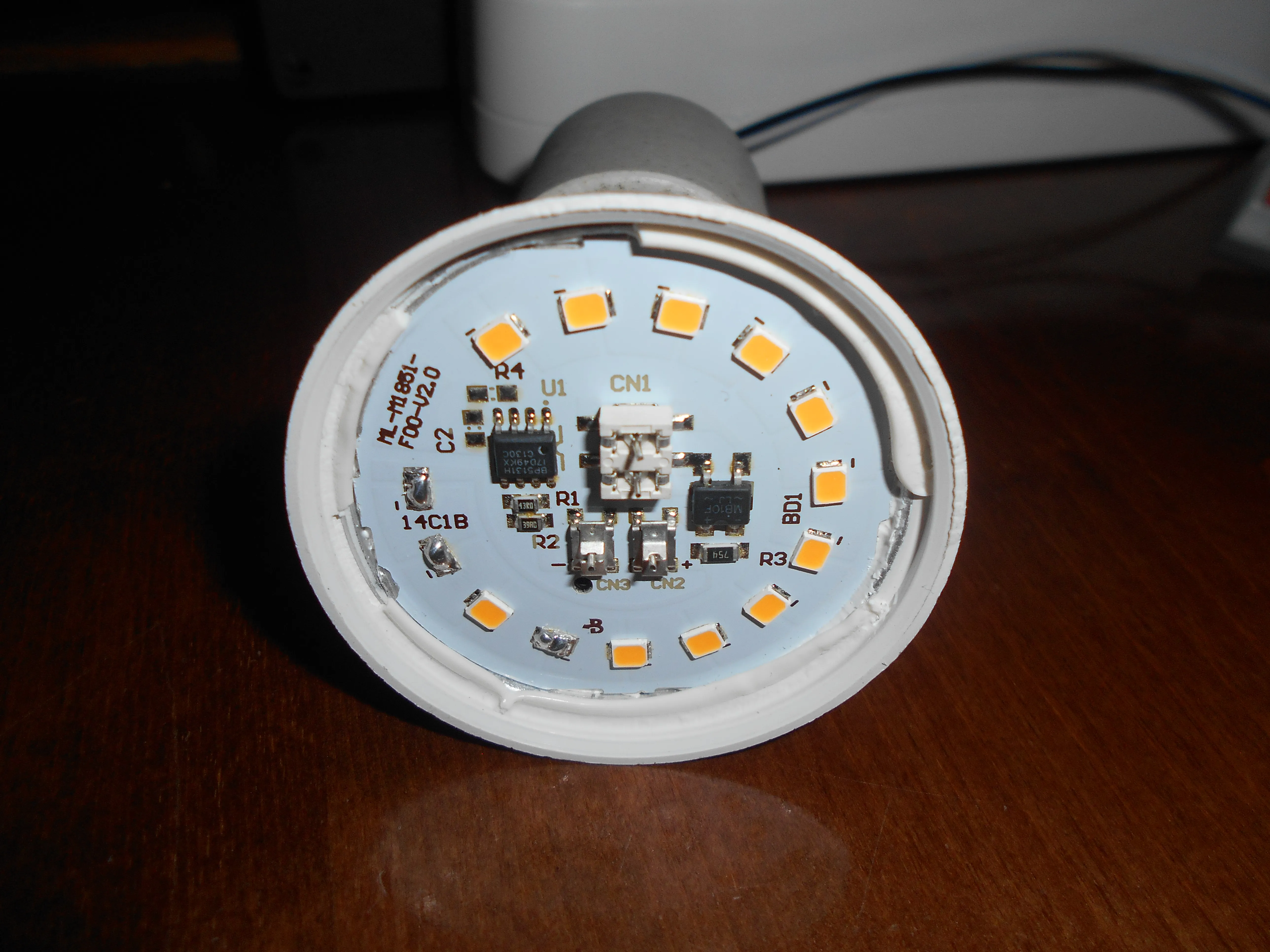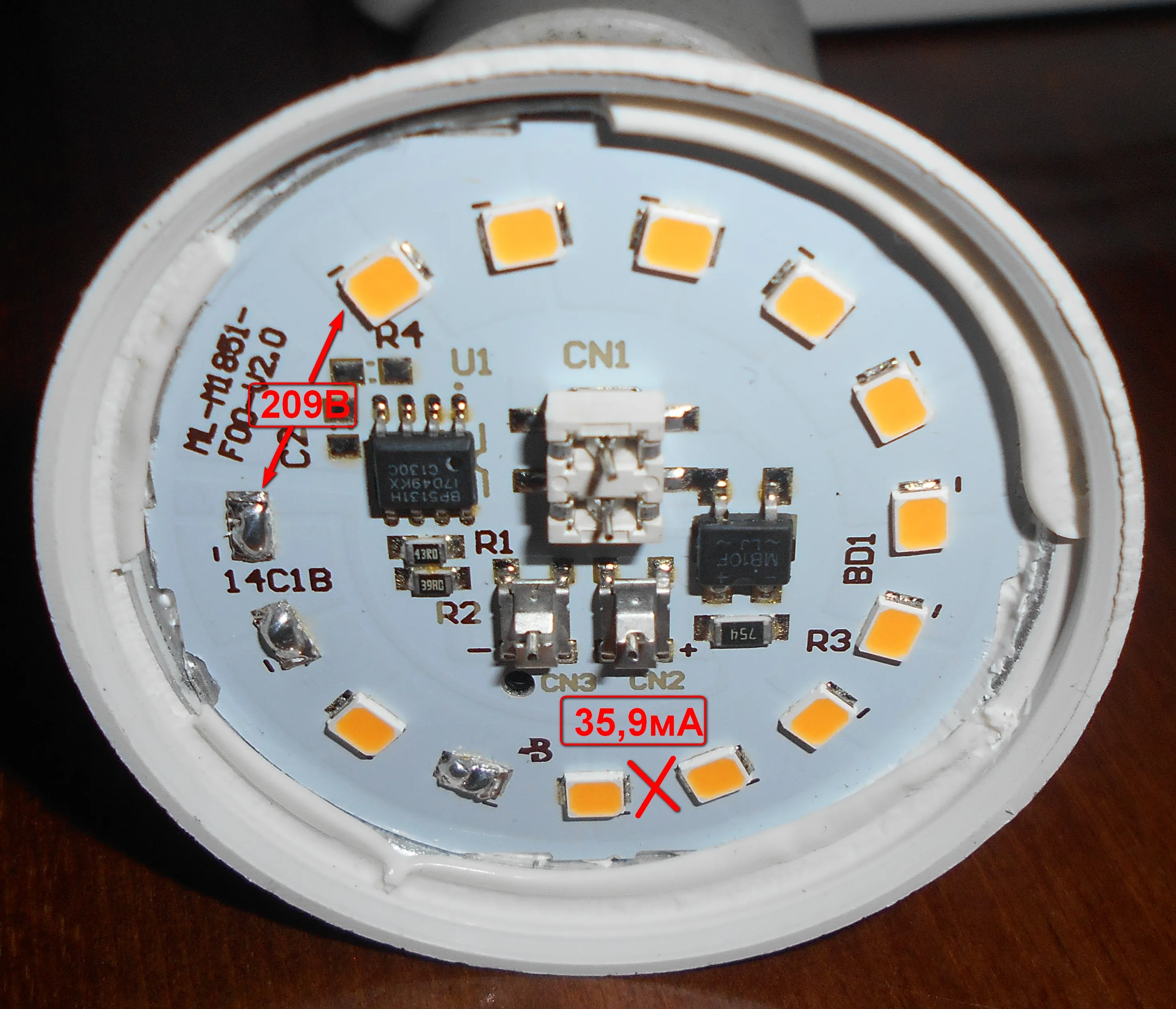 Всем здравствуйте . Сегодня я покажу насколько нецелесообразно исключать светодиоды из схемы светодиодной лампы с линейным драйвером. В результате проверки было выявлено три неисправных светодиода. В лампе применили светодиоды на 18 Вольт . Исключаю их из схемы .