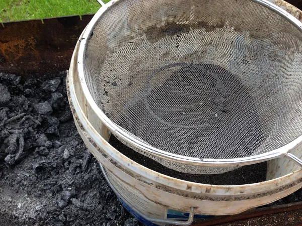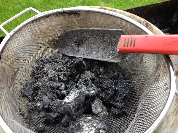 Потом начинаю совком набирать их в сито и трясти, в ведро сыпется зола, а крупные кусочки угля отбрасываю на свободное место в мангале.
